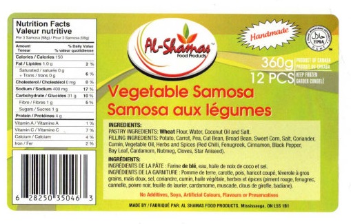 | Al-Shamas Food Products | Vegetable Samosa | 360 g (12 pieces) |