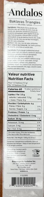 | Andalos | Baklavas Triangles | 1200 g (48 pieces) | 7 74005 00024 1 | 13525, 13625, 14125, 14325, 15625, 17025, 18425 | N/A |