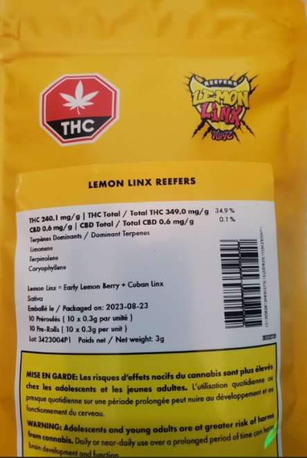 | Nugz Lemon Linx Reefers pre-rolls | 3423004P1 | 10 units x 0.3g/unit (3.0 g) | 2023-08-23 | THC: 240.1 mg/g Total THC: 349 mg/g | THC: 22.9 mg/g Total THC: 209.3 mg/g |