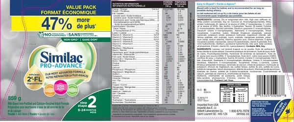 | Abbott | Similac Pro-Advance Step 2 Milk-Based Iron-Fortified and Calcium-Enriched Infant Formula Powder | 859 g | 0 55325 00288 8 | All lot codes where: |