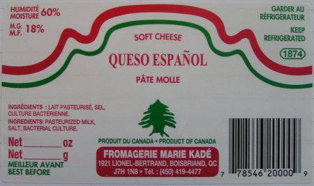 | Fromagerie Marie Kadé | Queso Espanol* | 300 – 400 g | 7 78546 20000 9 | 18 NOV 2011 |