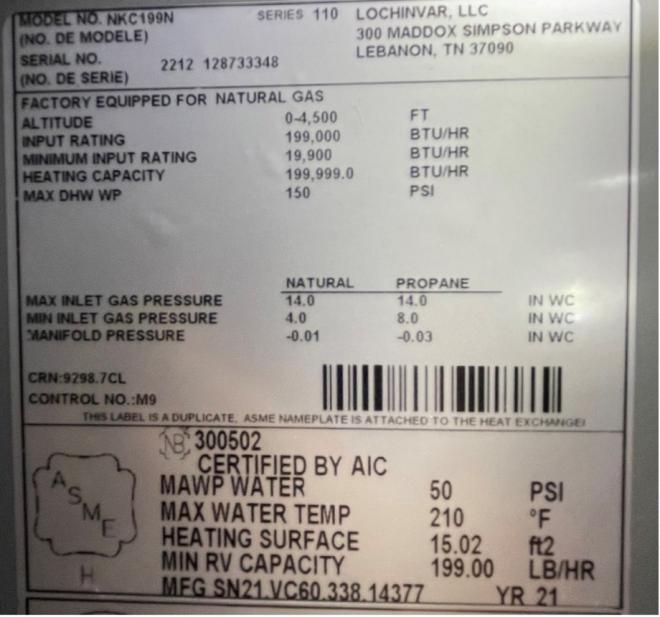 | Lochinvar/Epic Brand | EFC110L EFC110N EFC150L EFC150N EFC199L EFC 199N EPB080N EPB110L EPB110N EPB150L EPB150N EPB199N EPC110L EPC110N EPC150L EPC150N EPC199L EPC199N | Range from 125325485 through 134830284 |