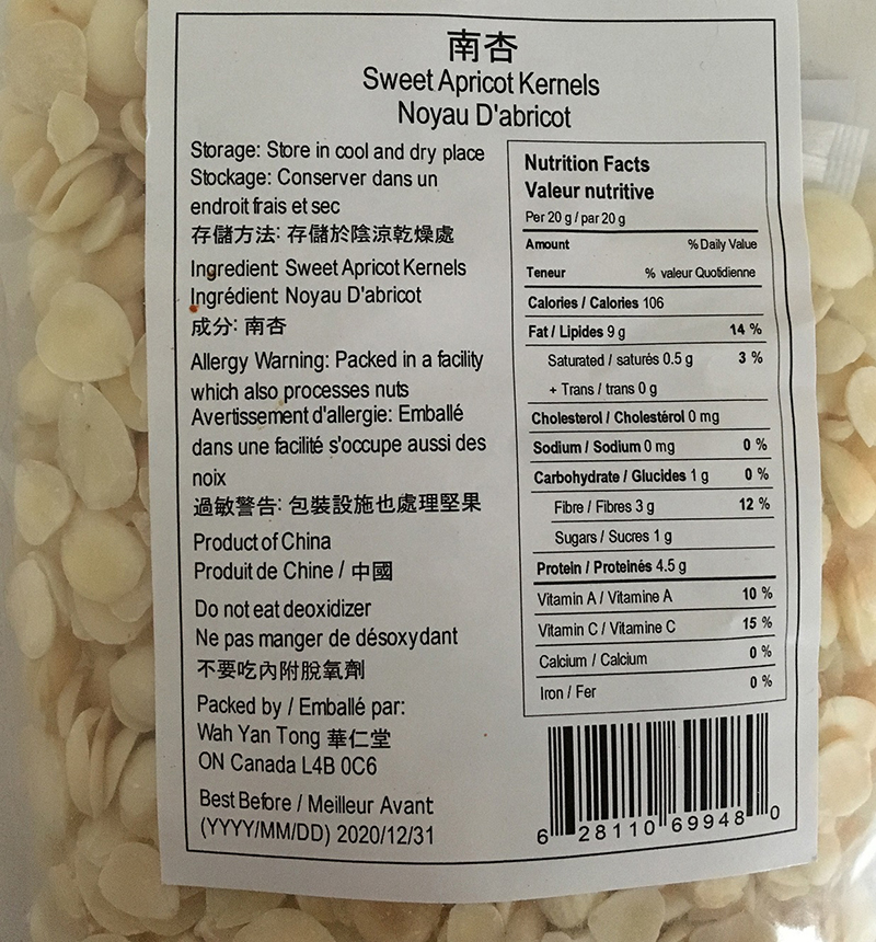 | None (Chinese characters only) | Sweet Apricot Kernels | 150 g | 6 28110 69948 0 | Best Before 2020/12/31 |