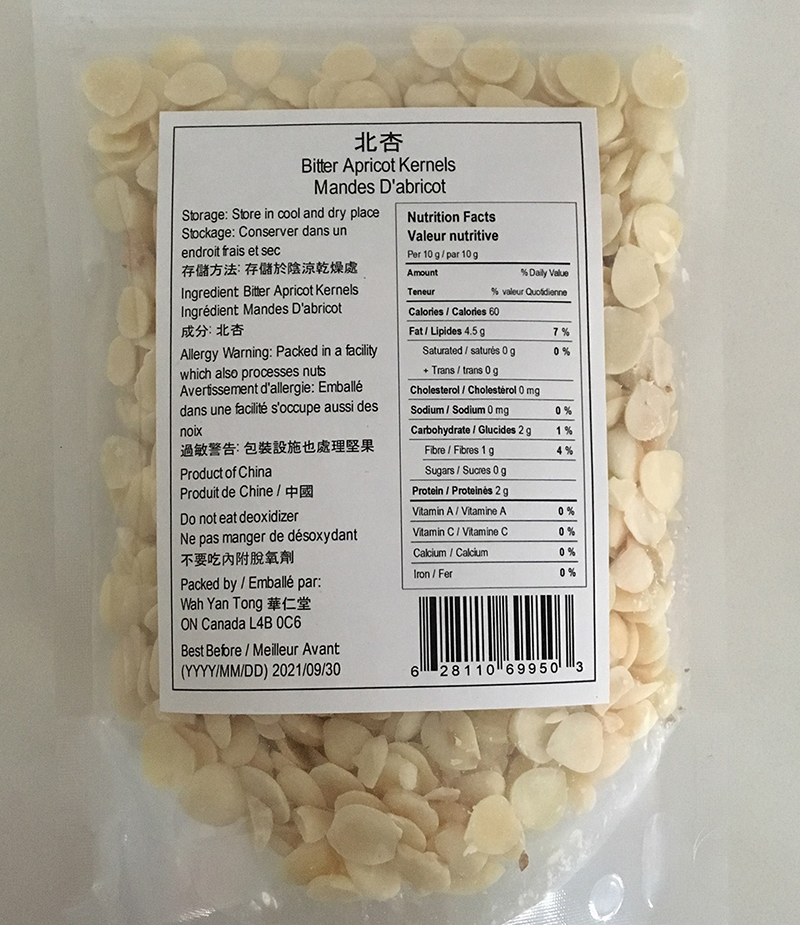 | None (Chinese characters only) | Bitter Apricot Kernels | 150 g | 6 28110 69950 3 | Best Before 2021/09/30 |