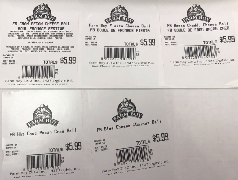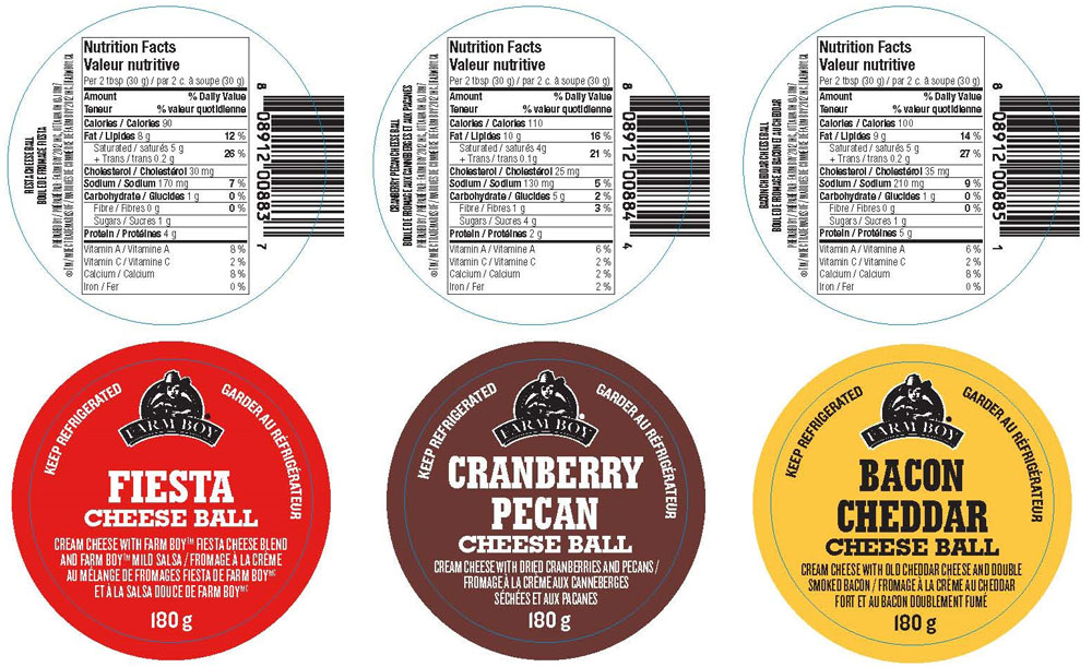 | Farm Boy | Cranberry Pecan Cheese Ball and/or "FB Cran Pecan Cheese Ball" | 180 g | 8 08912 00884 4 or Starting with 0 232337 | All units sold up to and including November 17, 2019 |
