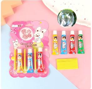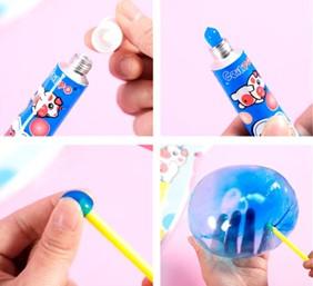 Balloon blowing kits are toys that consist of a solvent mixture in a tube and short plastic straws for blowing. Children can form balloons or bubbles by slowly squeezing out a ball of the mixture from the tube and sticking it on the end of the straw. The child then blows through the straw to create a bubble.