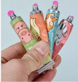 Balloon blowing kits are toys that consist of a solvent mixture in a tube and short plastic straws for blowing. Children can form balloons or bubbles by slowly squeezing out a ball of the mixture from the tube and sticking it on the end of the straw. The child then blows through the straw to create a bubble.