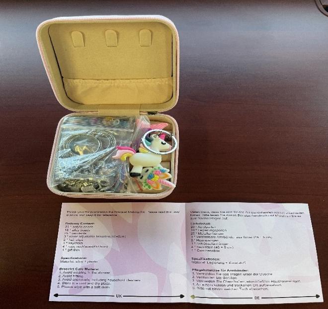 This alert involves SUZUTOY Charm Bracelet Making Kit for Girls, for children over 4 years old. The arts and craft kit contains various beads and pendants, adjustable bracelets, hair clips, keychain and rope necklaces. "Hello Princess" and "You Are My Little Princess Beautiful" is written on the pink gift box.