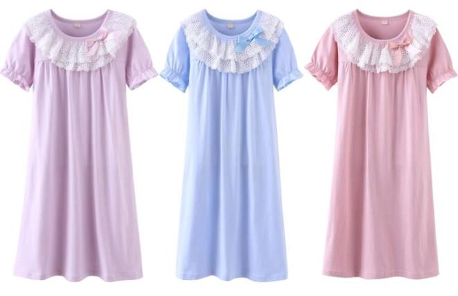 Zegoo-branded 100% cotton children’s nightgowns are sold in purple, blue, and pink. The nightgowns are short-sleeved and have a double-lace layer at the collar with a small ribbon bow. A side-seam label lists the size, “100% Cotton,” and “MADE IN CHINA.”