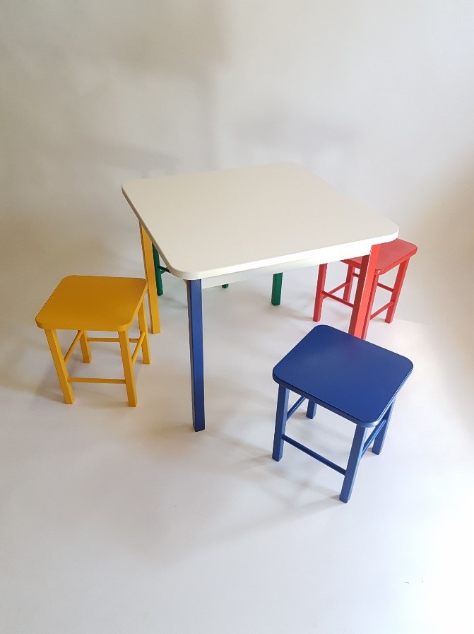 This recall involves the table and stool set # 340 manufactured by J.B. Poitras. The set consists of four coloured stools in yellow, red, blue and green as well as a white table top with coloured legs in yellow, red, blue and green.