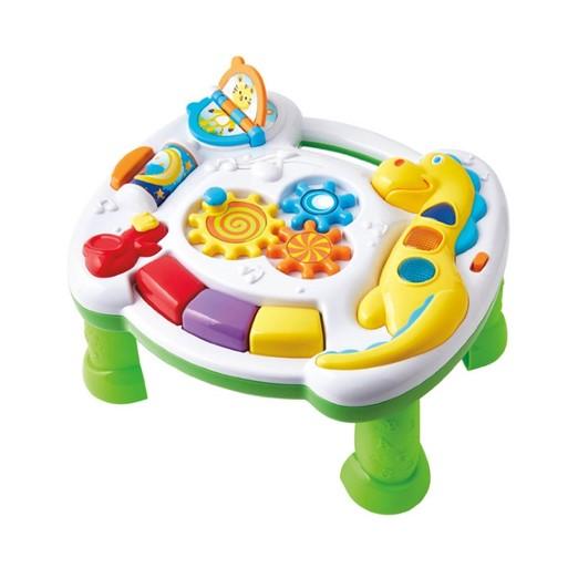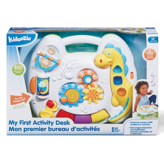 This recall involves the Kidoozie Brand My First Activity Desk, model number G02587 with UPC 020373035875. The activity desk can be played with on a tabletop, floor or crib. It is meant for use by children 12 months and older. It has removable legs and adjustable crib straps and has the following dimensions 38.1 cm x 8.3 cm x 26.7 cm.