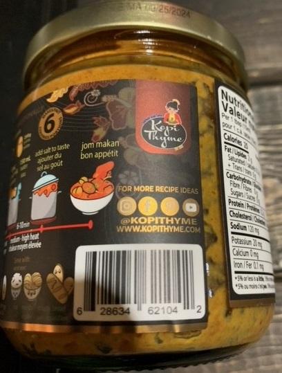 | Kopi Thyme | Kari Ayam – Malaysian Style Aromatic Curry Paste | 250 mL | 6 28634 62104 2 | All Best Before dates up to and including 09/25/2024 |