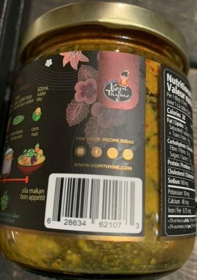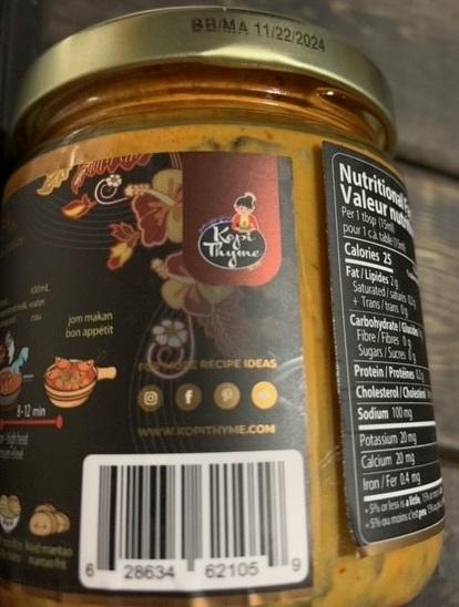 | Kopi Thyme | Nyonya Laska – Curry Noodle Soup Base | 250 mL | 6 28634 62108 0 | All Best Before dates up to and including 09/25/2024 |
