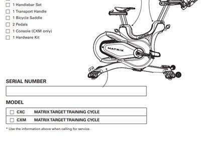This recall involves certain Matrix-brand Training Cycles models CXP-03, CXC-02, CXM-03, CXV and CXM-02. The affected products have adjustable saddles and handlebars with an aluminum rear flywheel and a magnetic resistance system. They have matte black steel frames, forged steel cranks, dual-sided SPD pedals, four leveling feet and two transport wheels. "Matrix" is printed on the side. The model and serial numbers are located on a label on the lower rear area of the cycle frame. Recalled cycles have a serial number that contains a serial prefix of FC32, ZFC32B, FC33, FC36, FC29D or FC27.