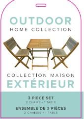 This recall involves the Outdoor Home Collection 3-Piece and 5-Piece Tan Bistro Sets. The set consists of one small wooden table and two or four folding chairs made with wood frames and black, navy, or white roping on the seat and back.