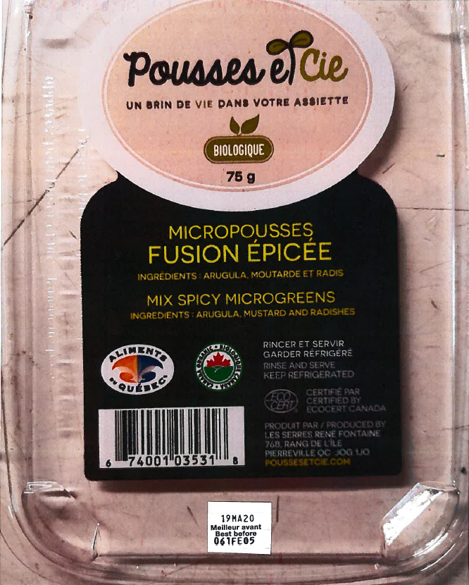 Ottawa, May 22, 2019 - Les Serres René Fontaine Inc. is recalling Pousses et Cie brand Mix Spicy Microgreens from the marketplace due to possible Listeria monocytogenes contamination. Consumers should not consume the recalled product described below.