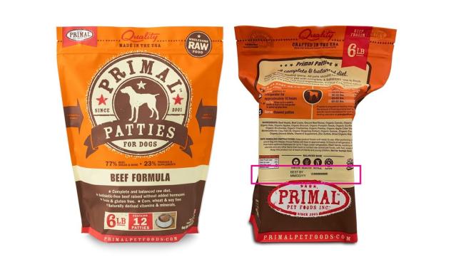 This recall involves the following raw frozen Primal Patties for Dogs Beef Formula sold in British Columbia: