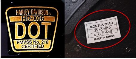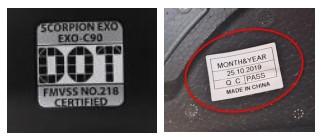This recall involves Scorpion EXO-C90 motorcycle helmets produced between August 2021 through May 2022 and Harley-Davidson HD-X06 motorcycle helmets produced between August 2021 through April 2022. All sizes of helmets are included. The helmets name can be found on the Department of Transportation (DOT) certification label on the back of the helmet, and the production date is identified in the QC sticker as shown in the DOT sample images. The QC sticker, including the production date, can be found on the inner wall of the EPS liner after peeling off the crown liner.