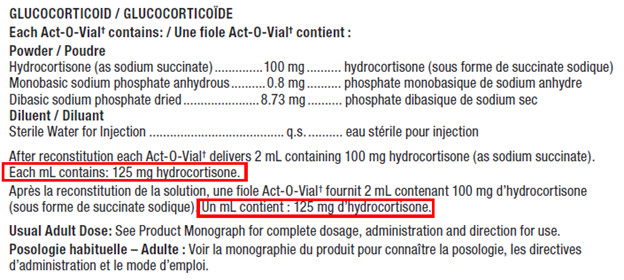 Solu-Cortef (hydrocortisone sodium succinate for injection) 100 mg /2 mL single-dose Act-O-Vial has a labelling text error on the side panel of the carton. It indicates that the reconstituted product contains 125 mg/mL hydrocortisone instead of 50 mg/mL (see visual below).