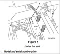 The model number and serial number are located on a decal affixed to the frame, under the seat.