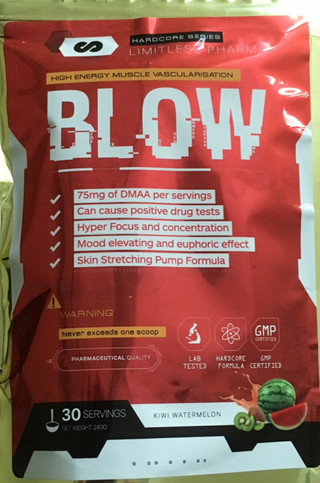 “Blow” is promoted as a pre-workout supplement and is labelled to contain the unauthorized drug 1,3 Dimethylamylamine (DMAA), which may pose serious health risks such as high blood pressure and stroke.