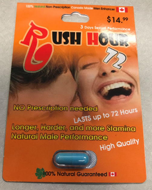 | Rush Hour 72 | Tested and found to contain sildenafil, tadalafil, desmethyl carbodenafil, and dithiodesmethyl carbodenafil (added October 6, 2017) | |