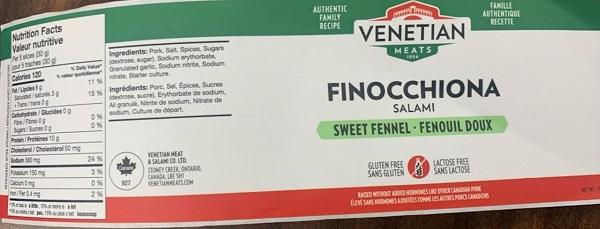 Venetian Meats brand Finocchiona Salami Sweet Fennel recalled due to Salmonella
