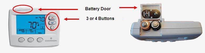 Recalled thermostats do not show a battery icon on the left side of the screen and includes models 1F80-04xx, 1F83-04xx, 1F85-04xx and 1F86-04xx. The model numbers for the affected thermostats are shown on a sticker on the back of the thermostat or on the thermostat mounting plate. However, the battery door location and buttons allow the thermostats to be identified without having to remove the thermostat to check the model number sticker.