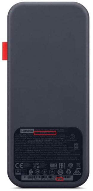 Le numéro de modèle PBLG2W se trouve à proximité de l’inscription « Lenovo » en haut de l’étiquette du produit située à l’arrière de la batterie externe. La date de fabrication (année/mois) se trouve sous le code-barres, en bas à droite de l’étiquette du produit.