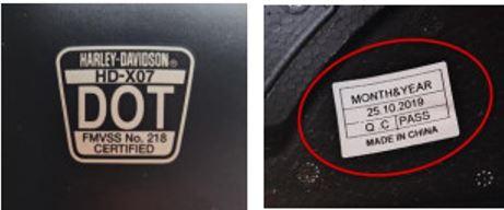 Le présent rappel vise les casques de motocycliste Scorpion EXO Covert X produits entre septembre 2021 et janvier 2024 et les casques de motocycliste Harley-Davidson HD X07 produits entre juillet 2021 et février 2024. Toutes les tailles de casques sont incluses. Le nom du casque figure sur l’étiquette de certification du Département des Transports des États-Unis (DOT) à l’arrière du casque, et la date de production est indiquée sur l’autocollant du QC, comme le montrent les exemples d’images du DOT. L'autocollant de contrôle de qualité se trouve sur la paroi intérieure de la doublure EPS après avoir décollé la doublure de la couronne.