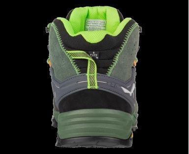Ces chaussures sont dotées d'une semelle Vibram noire, d'une étiquette GORE-TEX noire cousue, du nom de la marque SALEWA imprimé sur l'extérieur de la semelle noire, d'un motif de perforations triangulaires sur la tige en cuir suédé et d'un fin câble argenté attaché à un œillet rond brillant.