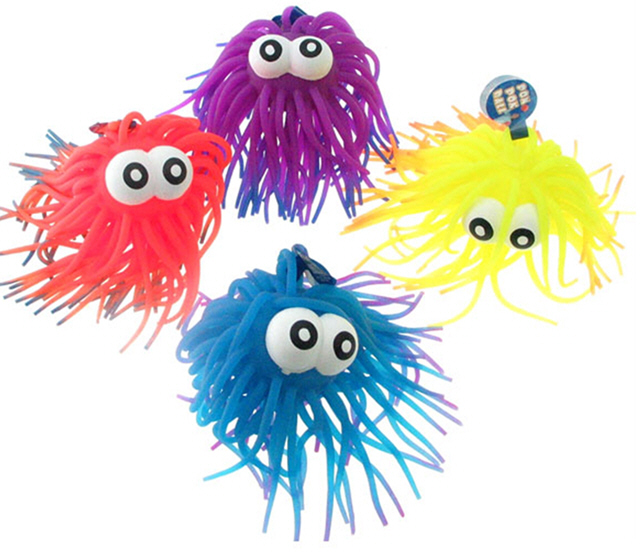 Le présent rappel vise des balles de type yo-yo en plastique mou élastique offertes en différentes couleurs et munies d'une courte boucle pour le doigt en plastique élastique. Le jouet est recouvert de pointes deux couleurs élastiques et est muni d'yeux exorbités blancs. La balle contient un centre clignotant qui est activé à l'impact. L'inscription « Pon Pon Ball » ainsi que le CUP #097138729187 figurent sur l'étiquette du produit.