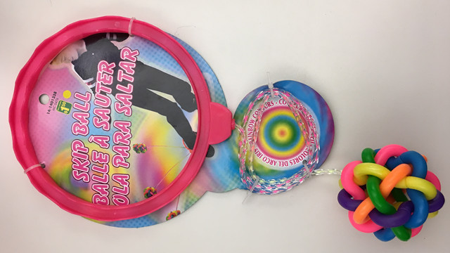 Le présent rappel vise des balles à sauter qui se composent d'une boucle pour cheville rose et d'une balle multicolore liées ensemble par un cordon en plastique. Le numéro de produit 14-1401338 figure sur la partie inférieure de l’emballage et le CUP 667888025213 figure à l'arrière.
