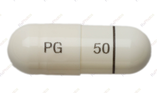 - La gélule de 50 mg est blanche avec les inscriptions « PG » et « 50 » imprimées en noir.