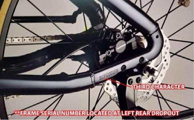 Les vélos portant un numéro de série dont le troisième caractère est « H », « J » ou « K » sont visés par ce rappel et doivent faire l’objet d’un remplacement gratuit de leur fourche. Les vélos portant un numéro de série dont le troisième caractère est « G » doivent faire l’objet d’une inspection visuelle supplémentaire par un distributeur agréé de Giant Bicycle pour déterminer l’état de la fourche.