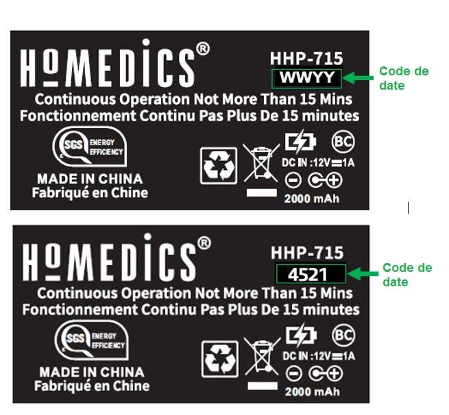 Ce rappel vise les masseurs HoMedics Therapist Select portant le numéro de modèle HHP-715 ou HHP-715-CA. Le produit est équipé d’un cordon d’alimentation de 120 VAC, 60 Hz. La mention « HoMedics » est imprimée sur le côté du corps du produit. Les produits sont de couleur noire et comportent une poignée, un boîtier et une tête de massage fixée à l’extrémité. Le produit comporte quatre têtes de massage interchangeables. Seules les dates de fabrication antérieures à 2022 jusqu’à la fin de 2022 sont concernées par le rappel. La date de fabrication est représentée par un code de date figurant sur un autocollant apposé sous le corps du produit. Les codes de date sont un nombre à 4 chiffres (WWYY) où WW indique la semaine séquentielle de l’année et YY représente les deux derniers chiffres de l’année de fabrication. Seuls les produits dont le code « YY » se termine par 21 et 22 font l’objet de ce rappel. Le CUP du produit est 0031262099662.