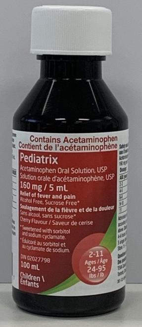 Teva Canada Ltd. rappelle un lot de Pediatrix solution orale d’acétaminophène suite à un test de routine du produit qui a démontré un taux supérieur à la limite acceptable d’acétaminophène dans le lot visé (environ 185mg/5mL plutôt que le taux approuvé et étiqueté de 160mg/5mL). Cette situation pourrait faire en sorte que des enfants reçoivent trop d’acétaminophène. Les enfants sont particulièrement à risque de ressentir les effets d’une surdose d’acétaminophène en raison de leur petite taille et de leurs corps en développement.
