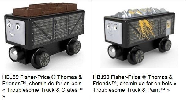 Le présent rappel vise le chemin de fer en bois Thomas & Friends™, « Troublesome Truck & Crates™ », ainsi que le chemin de fer en bois Thomas & Friends™, « Troublesome Truck & Paint™ ». Les produits sont des wagons de train en bois destinés aux enfants de deux ans et plus. Chaque wagon est équipé d’un connecteur contenant un aimant puissant qui permet de relier le wagon à d’autres wagons.