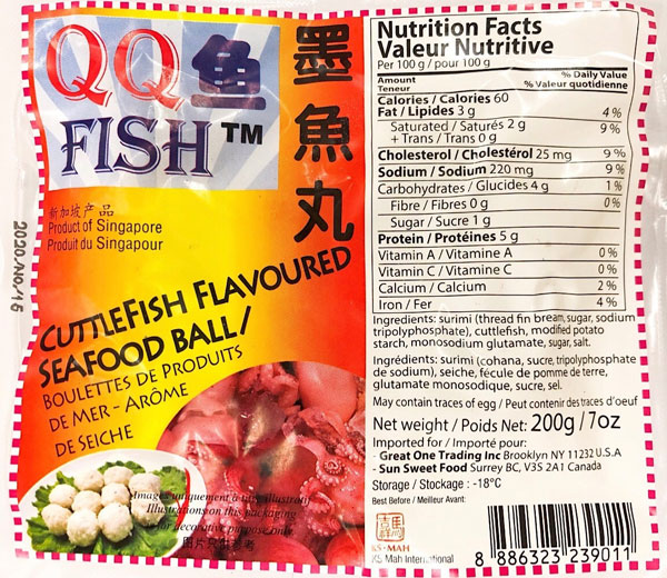 | QQ Fish | Croquette de poisson style de tofu | 200 g | Tous les codes dont l'étiquette ne fait pas mention d'œufs | 8 886325 910116 |