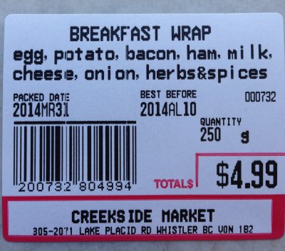| Creekside Market | « Breakfast Wrap » | 250 g | Date d'emballage jusqu'au 2014AL01 inclusivement et date Meilleur avant jusqu'au 2014AL11 inclusivement | 200732 804994 |
