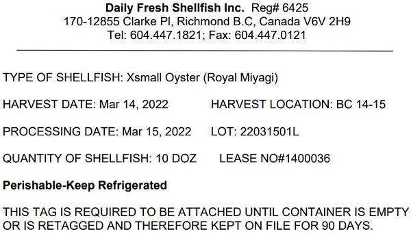 | Daily Fresh Shellfish Inc. | « Xsmall Oyster (Royal Miyagi) » | Variable | Aucun | « Harvest dates: March 14 to 21, 2022 Harvest Location: BC 14-15 Processing dates: March 15 to 24, 2022 Lots: 22031501L, 22031801L, 22032201L Lease No# 1400036 » |