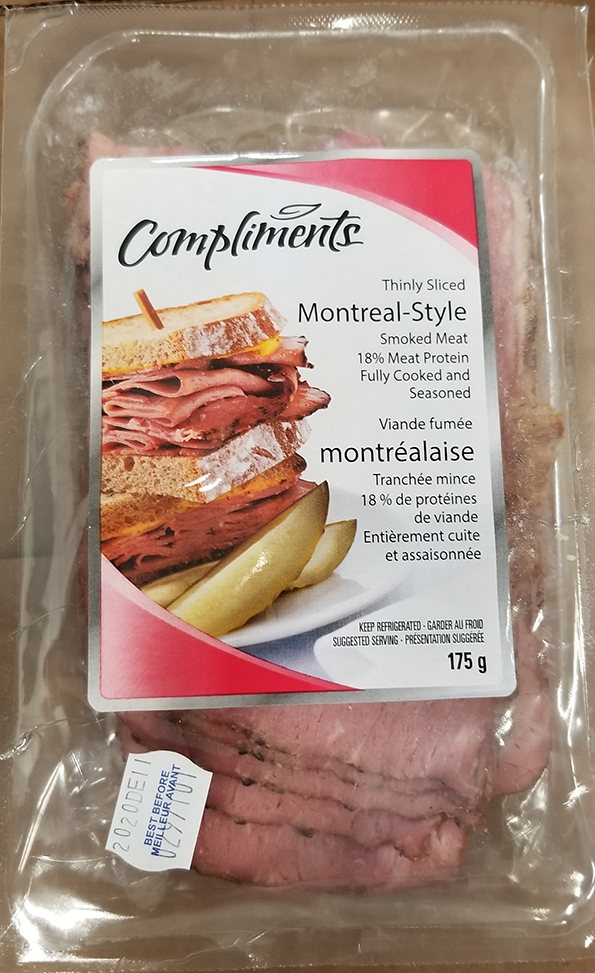 | Compliments | Viande fumée montréalaise | 175 g | 0 68820 13357 5 | MEILLEUR AVANT 2020/DE/11 ETA 48 |