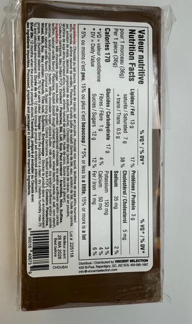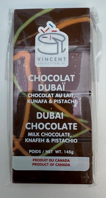 | Vincent Sélection | Chocolat Dubaï - chocolat au lait, kunafa & pistache | 145 g | 9 90016 40673 9 | Tous les lots de 225097 jusqu'à 225161 inclusivement |