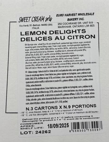 L'entreprises effectuant le rappel : Euro Harvest Wholesale Bakery, Importations Piu Che Dolci Inc.