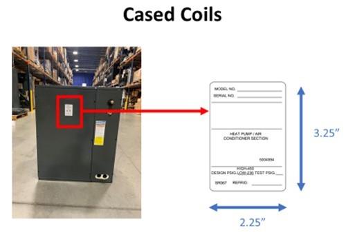Le serpentin d’évaporateur, qui se trouve tout en haut de la fournaise installée verticalement, sera soit tubé, soit non tubé. Le numéro de série de l’évaporateur à serpentin est affiché sur une étiquette apposée sur les modèles tubés et non tubés. Pour les évaporateurs à serpentin tubé, le numéro de série se trouve sur l’étiquette fixée au tube du serpentin. Pour les unités non tubées, le numéro de série se trouve sur une étiquette fixée à l’avant du serpentin.