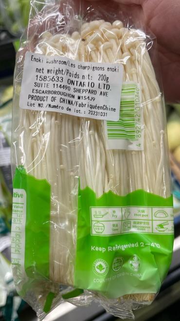 | Good | « Enoki Mushroom » (Les champignons enoki) | 200 g | 4 892742 010340 | Tous les emballages sans code sur l’étiquette et code 20231031 | Vendu dans les magasins T & T Supermarket en Ontario |