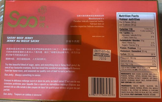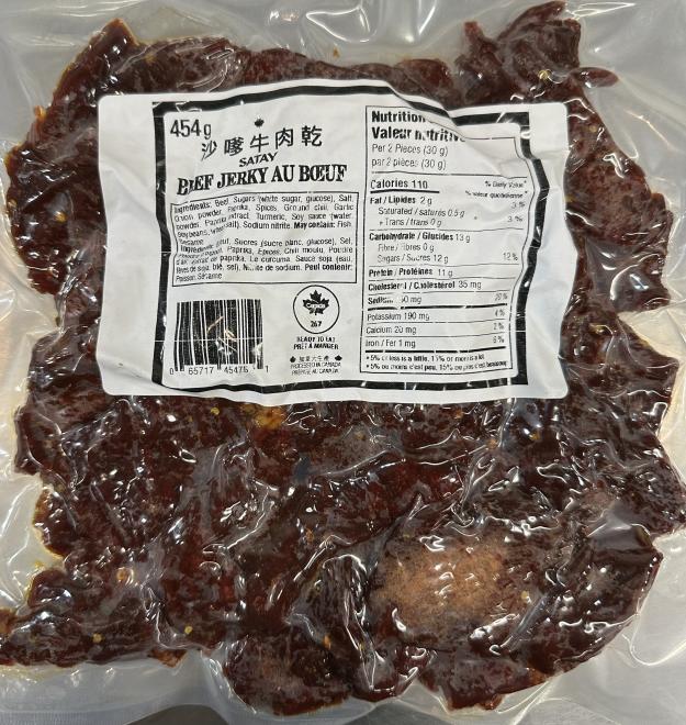 | Soo | Jerky au bœuf satay | 454 g | 0 65717 45475 1 | Tous les codes dont l'étiquette ne fait pas mention de moutarde |
