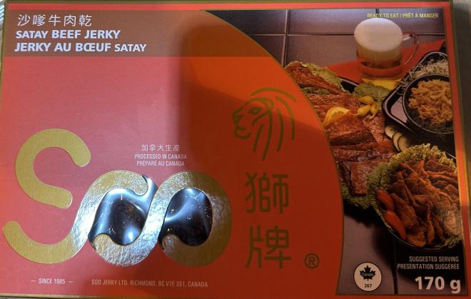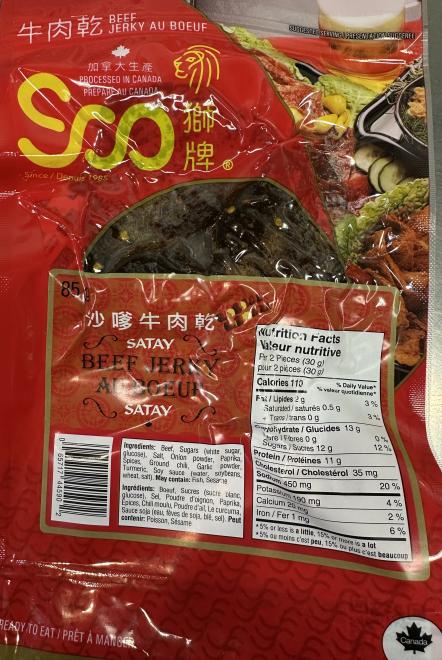 | Soo | Jerky au bœuf satay | 170 g | 0 65717 48430 7 | Tous les codes dont l'étiquette ne fait pas mention de moutarde |