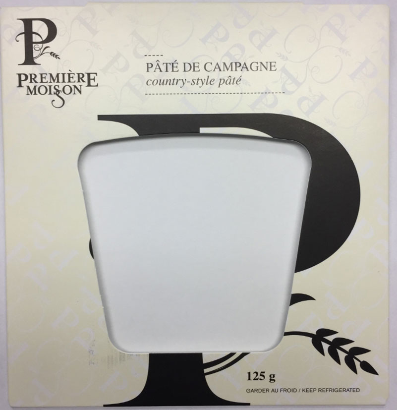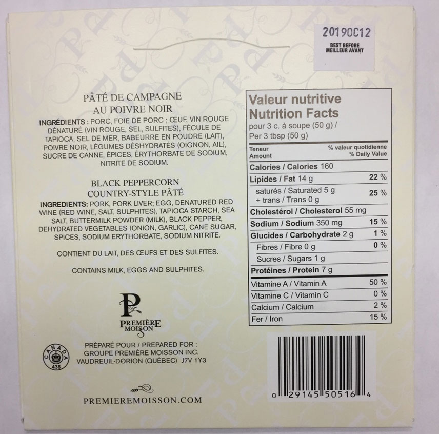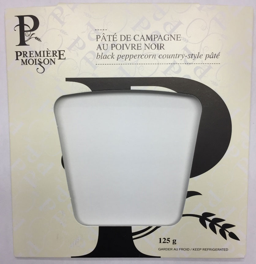 | Première moisson | Pâté de campagne au poivre noir | 125 g | Toutes dates « Meilleur avant » jusqu'au 2019OC12 inclusivement | 0 29145 50516 4 |