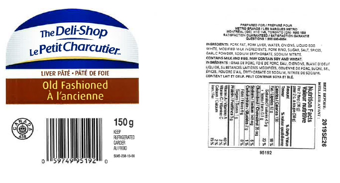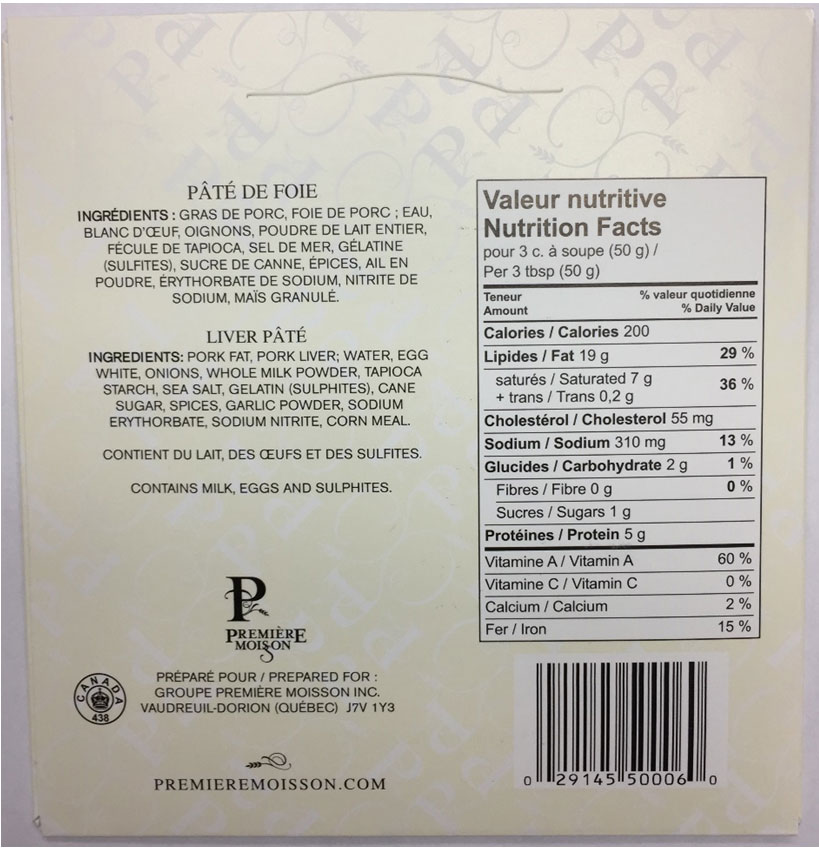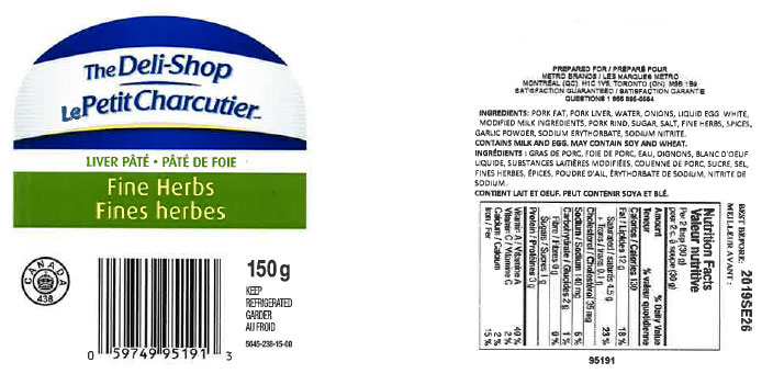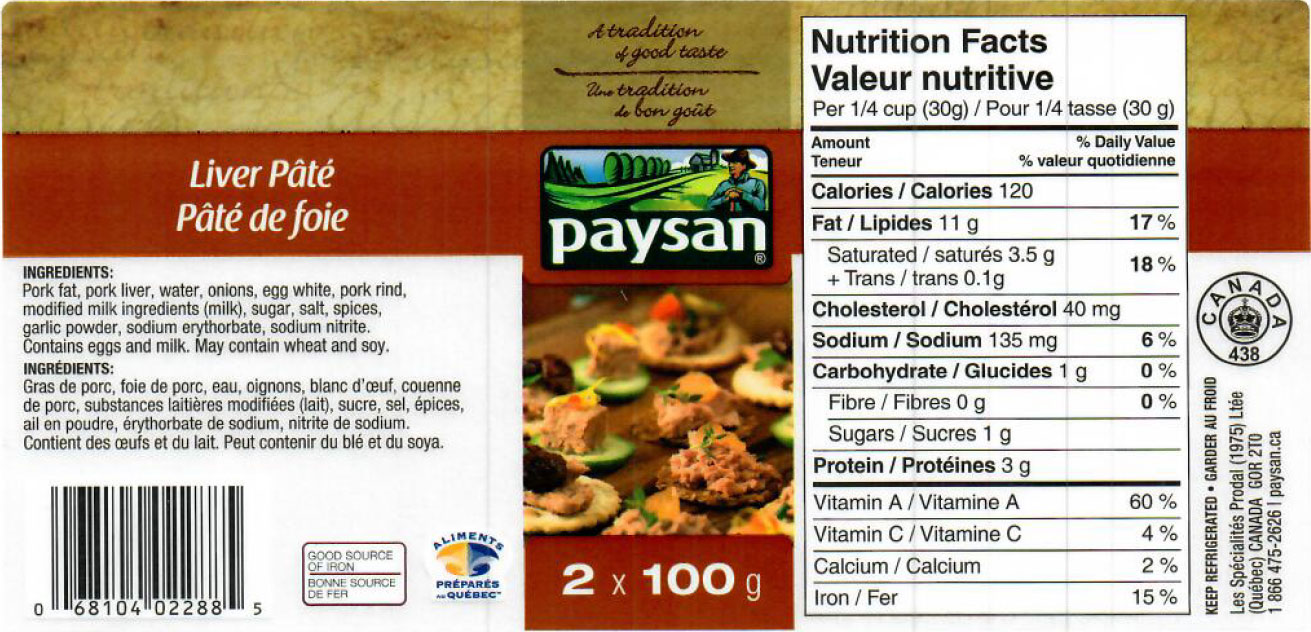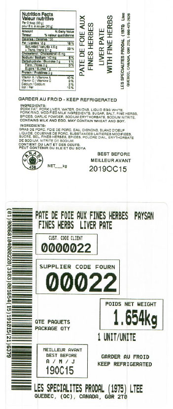 | Les Specialites Prodal (1975) Ltee | Pate de foie aux fines herbes | Variable | Toutes dates « Meilleur avant » jusqu'au 2019OC18 inclusivement | Variable |